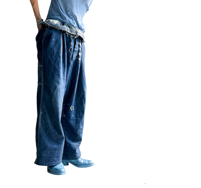 size 実寸約W50 実寸 ウエスト130cm レングス64cm ワタリ幅43cm 裾幅31cm [コンディション] ダメージ等見られますが、着用には問題なく、良い雰囲気かと思います。 古いオーバーオールを大胆にカットオフ。 ベルトループもないありのままの姿。 そんな手間も楽しめそうな最高のルックス。 是非チャレンジしてほしいアイテム。