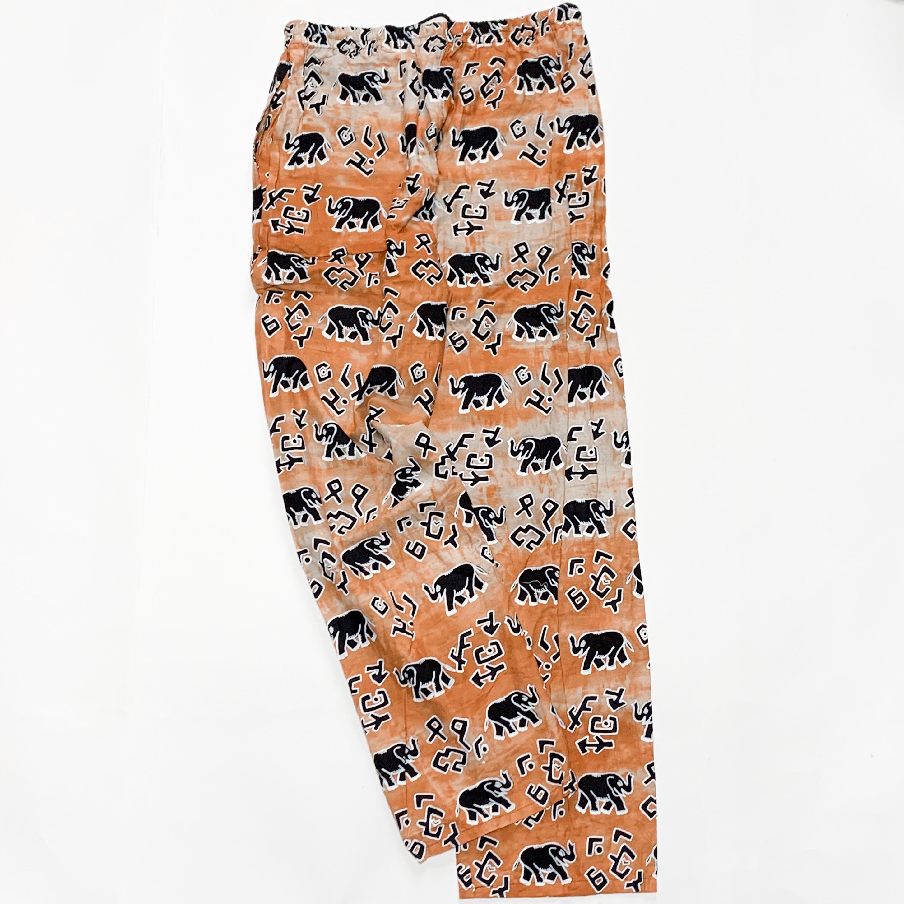 アフリカ、アジアンテイストをどちらも感じるエレファント柄のバティックパンツ。